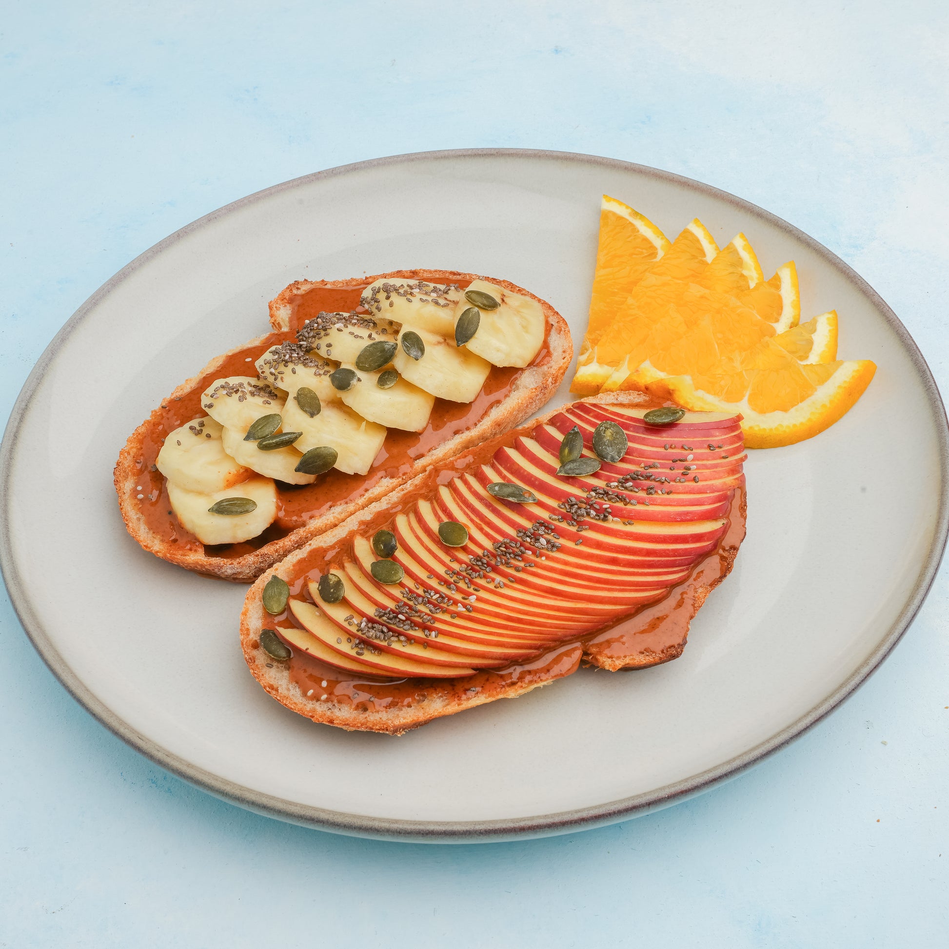 two slices of sourdough country loaf with the creamiest almond butter or peanut butter, banana (or seasonal fruit), honey and sprinkled with pumpkin seeds